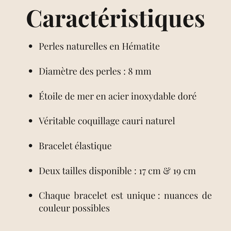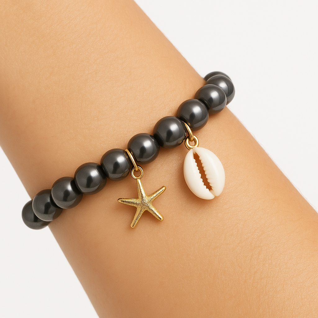 Un bijou raffiné et intemporel, composé de perles naturelles d’Hématite, sublimées par deux breloques dorées en acier inoxydable : un coquillage cauri et une étoile de mer.