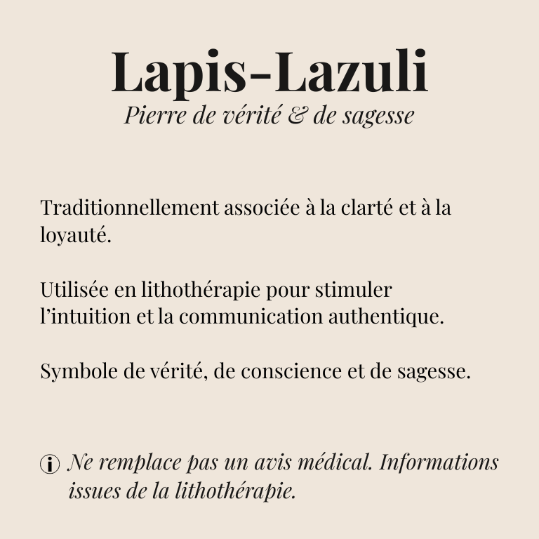 Vénéré depuis l’Antiquité, le Lapis Lazuli est reconnu pour stimuler la sagesse intérieure, renforcer la confiance en soi et favoriser une communication authentique. Pierre d’intuition et de clarté, elle invite à exprimer sa vérité avec sérénité.