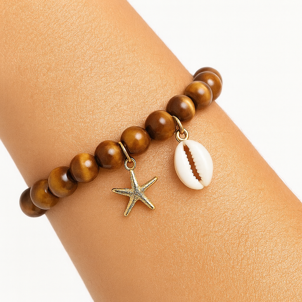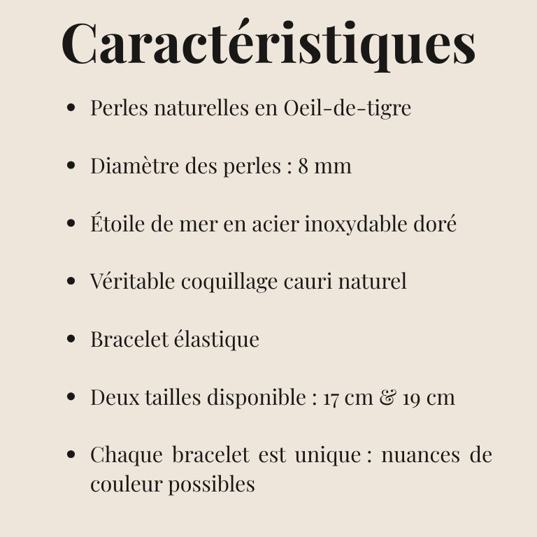 Un bijou au caractère affirmé, composé de perles naturelles d’Œil de Tigre, sublimé par deux breloques dorées en acier inoxydable : un coquillage cauri et une étoile de mer.