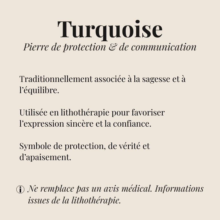 Reconnue depuis l’Antiquité pour ses vertus protectrices, la Turquoise favorise la communication sincère, renforce la confiance en soi et attire la chance. Véritable pierre d’harmonie, elle aide à équilibrer les émotions et à apaiser l’esprit.