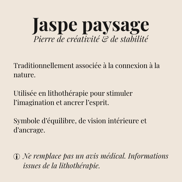 Pierre d’ancrage et de stabilité, elle aide à se relier à la Terre, à cultiver la patience et à renforcer la créativité.