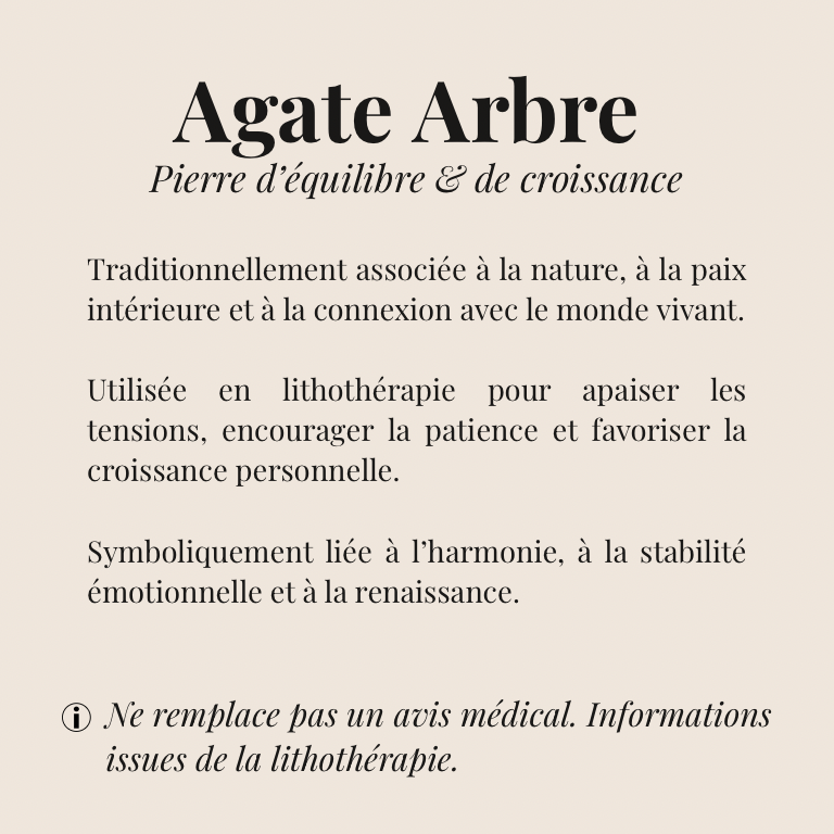 Pierre d’harmonie et de croissance, l’Agate Arbre est traditionnellement associée à la paix intérieure et à la stabilité.
